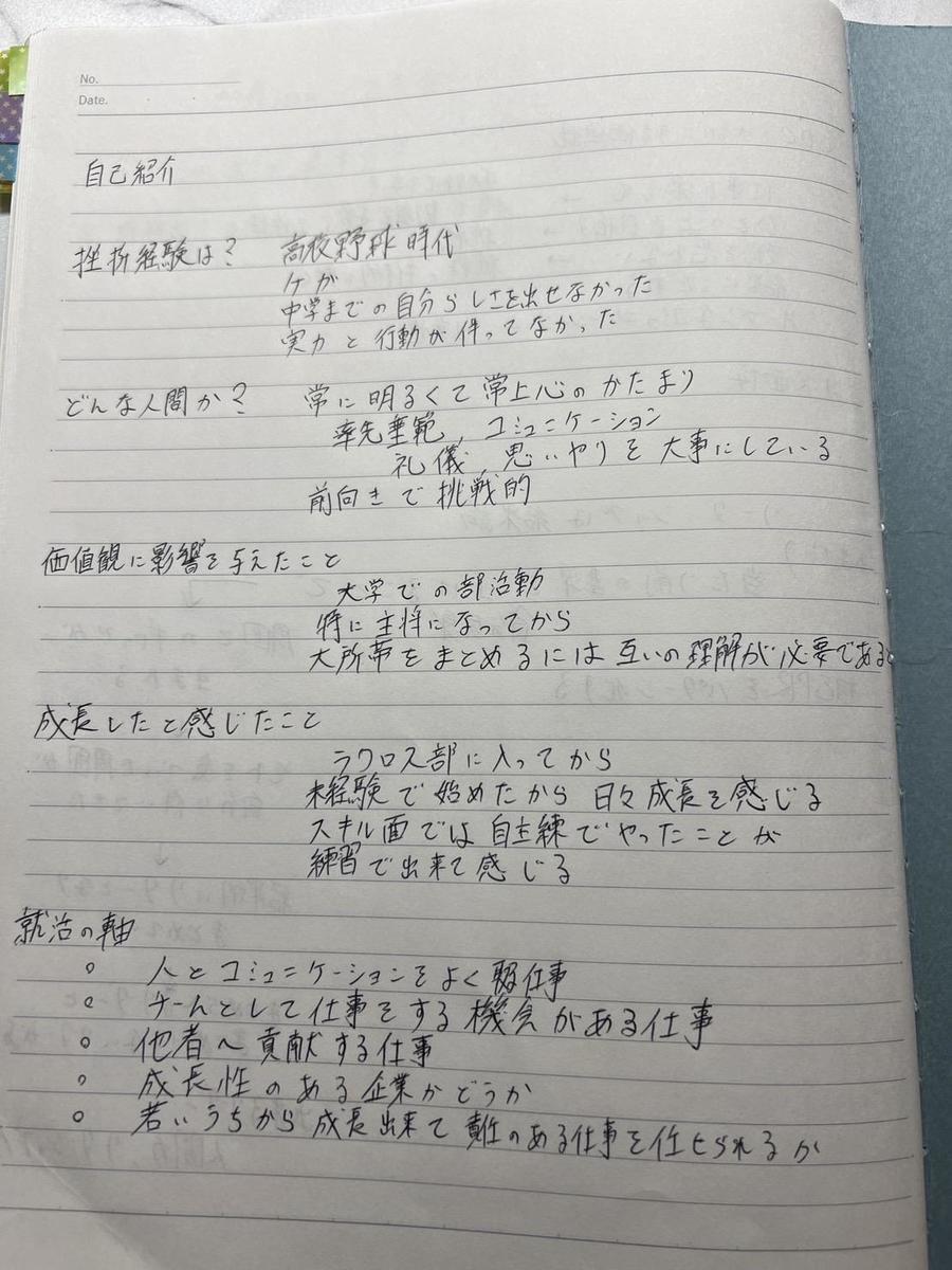 想定されそうな質問と回答、それに紐づく自分の価値観や経験を線で繋いで、論理性が一目でわかるようノートにまとめていました。